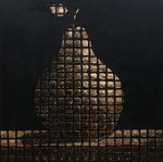 2018Mixed media, acryl, olieverf, zwart, koper. Mixed media, olieverf, acryl, brons, koper, zwart, diepte. De vierkantjes zijn gemaakt van een natuurlijke substantie en zijn gemiddeld 0,5-1 cm hoog. Afhankelijk van lichtinval op schilderij wordt de uitstraling verkregen doordat de vierkantjes niet identiek zijn.