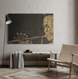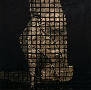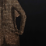 2019Mixed media, acryl, olieverf, zwart, brons, diepte. De vierkantjes zijn gemaakt van een natuurlijke substantie en zijn gemiddeld 0,5-1 cm hoog. Afhankelijk van lichtinval op schilderij wordt de uitstraling verkregen doordat de vierkantjes niet identiek zijn.